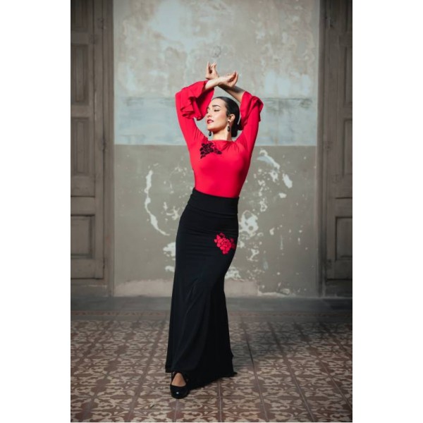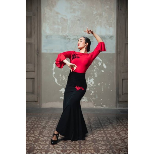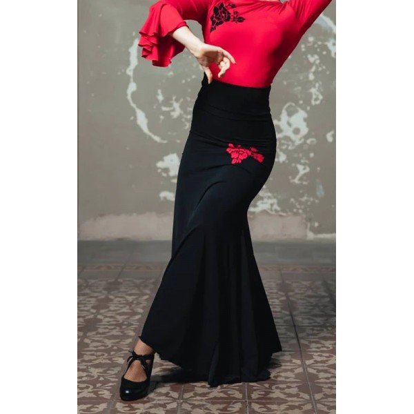 Falda flamenco entallada de Davedans.Confeccionada en punto elástico.Con un fajín que se ciñe a la cintura - cadera y realza la silueta.Los godets laterales y centrales proporcionan el vuelo y la amplitud necesarios para giros y movimientos característicos del flamenco, aportando un aire dinámico y elegante.Un detalle distintivo de este modelo es la aplicación decorativa de flor roja a media altura del muslo, que añade un toque sofisticado. El color puede variar dependiendo del monitor y tipo de pantalla que utilice. HECHO EN ESPAÑA Más infromación sobre las tallas Davedans.